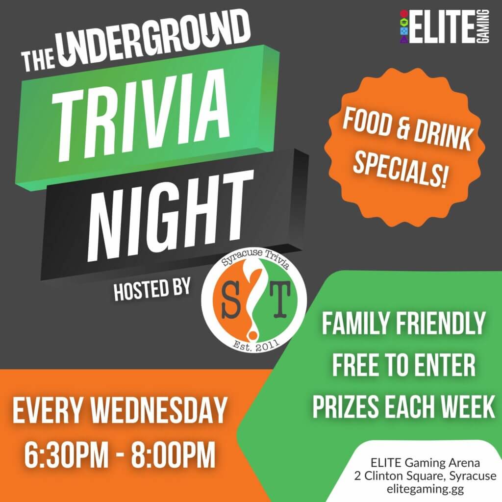 Each week features a fresh mix of questions — from gaming and pop culture to general knowledge — with special themed nights sprinkled in. Whether you’re a casual fan or a trivia champ, there’s something here for everyone. Hosted by Syracuse Trivia Company on Wednesdays and ELITE Gaming on Fridays!